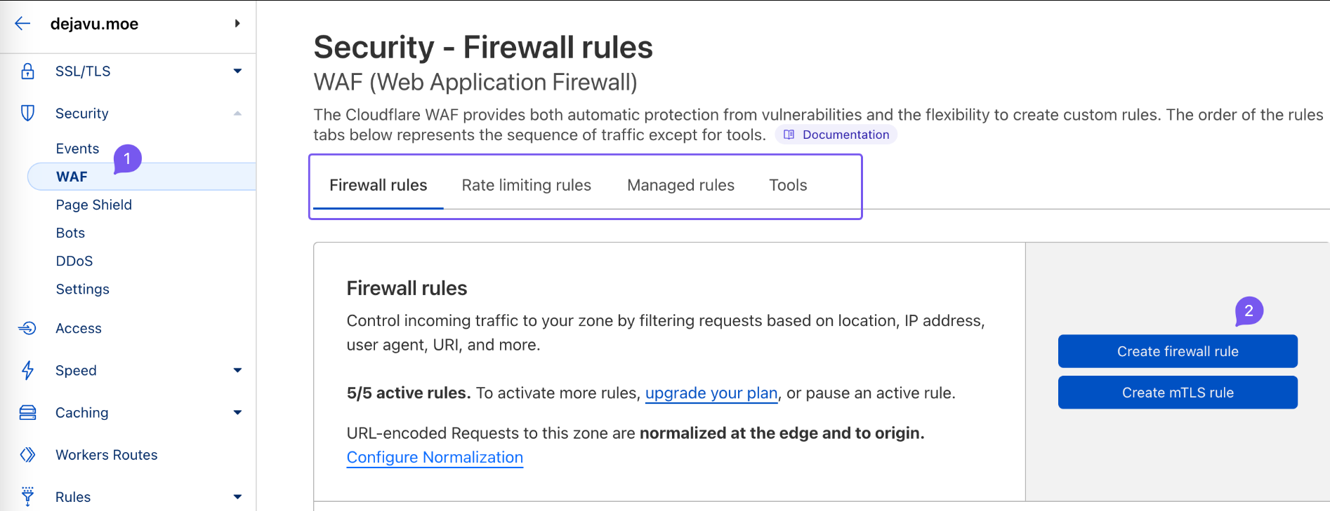 在 Cloudflare 仪表盘上按照下列步骤创建 WAF 防火墙规则