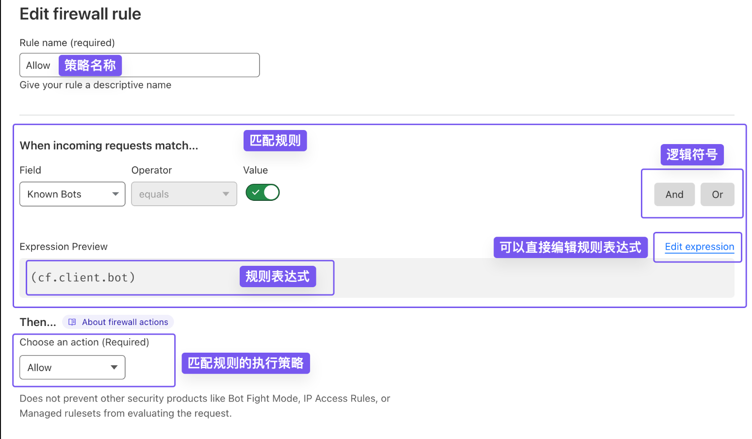 Known Bots 是一个预定义的策略变量,用于检测请求是否来自 Cloudfare 已知的爬虫或机器人,它是一个 Boolean 值:True 或 False。
