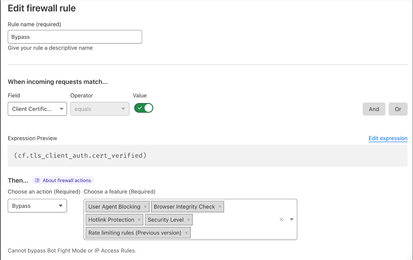 下面示例表示:当 TLS 客户端证书经过验证时(一般是 Cloudflare 颁发的源服务器证书),流量直接绕过 WAF 的 部分特性,比如浏览器用户代理阻止策略、浏览器完整性检查策略、速率限制策略等等。