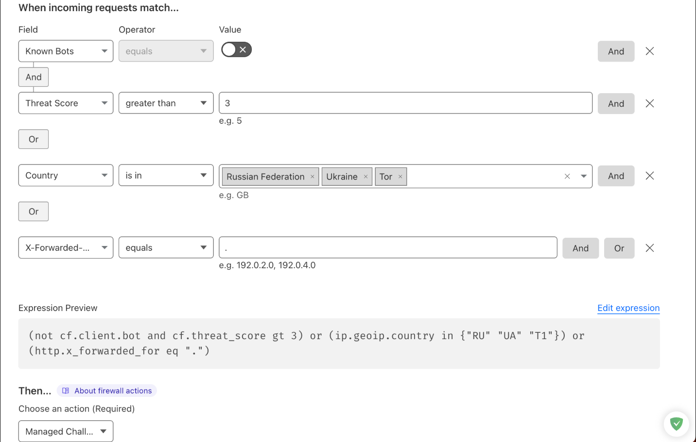 (not cf.client.bot and cf.threat_score gt 3) or (ip.geoip.country in {"RU" "UA" "T1"}) or (http.x_forwarded_for eq ".")