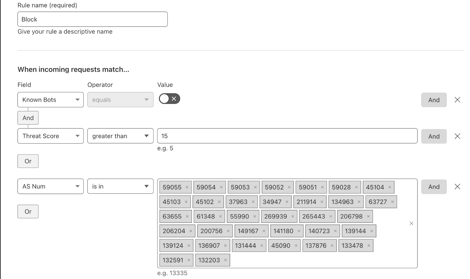 - 当不是已知机器人(cf.client.bot),且(and)威胁分数(cf.threat_score)大于 3 时,会匹配该规则