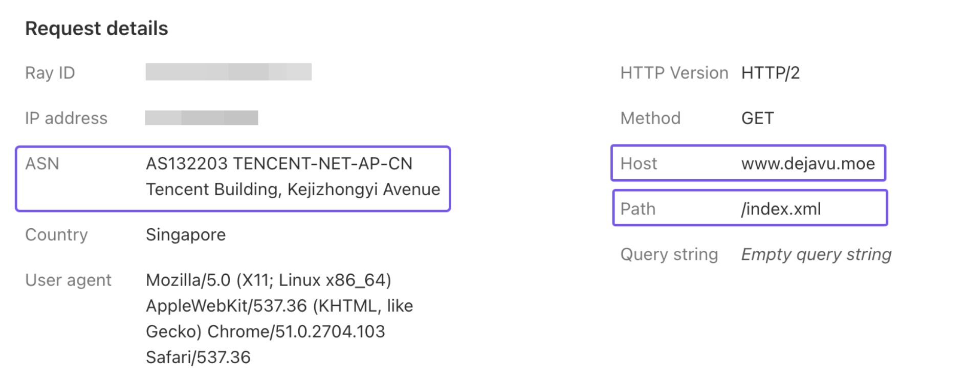 显然,这是一个运行在 XX 云(新加坡)服务器上的 RSS 订阅服务,被上面 Block 阻止规则的 ASN 匹配后封禁了。