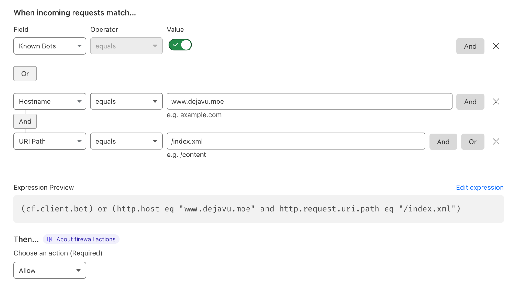 (cf.client.bot) or (http.host eq "www.dejavu.moe" and http.request.uri.path eq "/index.xml")