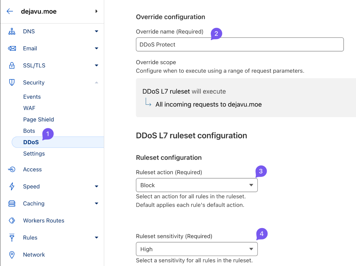 DDoS 保护策略,按照下图配置即可,Cloudflare 这个规则很精准的,基本没「误杀」情况