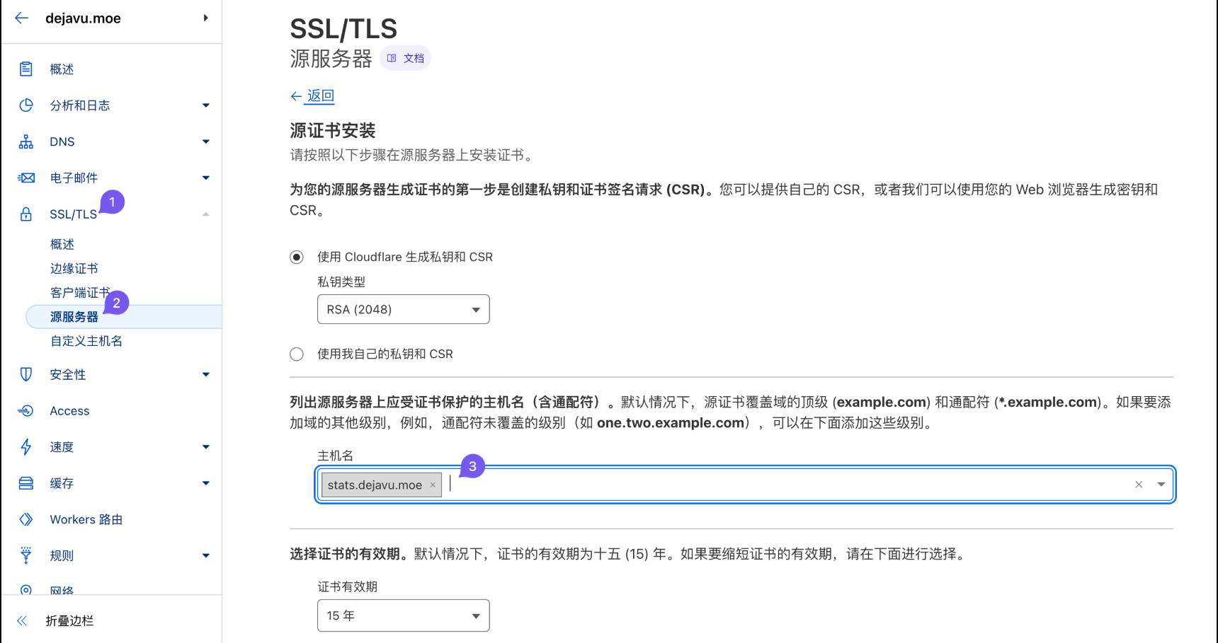 在 Cloudflare 上生成对应的源服务器 SSL 证书,有效期最长 15 年,这个证书只被 Cloudflare 自身信任
